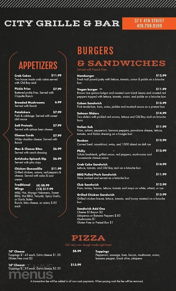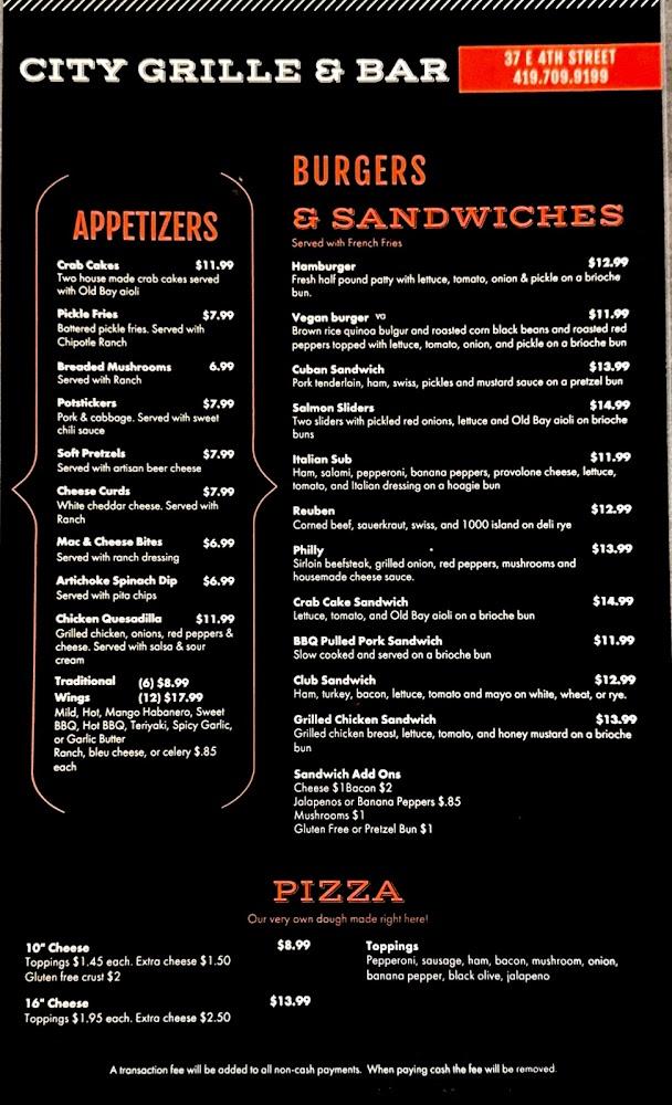 Welcome to City Grille in Mansfield, OH, your go-to destination for delicious American cuisine and a vibrant bar experience. Located at 37 E 4th St, we offer a relaxed atmosphere ideal for lunch, dinner, or solo dining. Enjoy an extensive selection of cocktails, beers, and wines, complemented by local specialties. Our menu features a variety of options including vegetarian dishes and shareable plates. With fast service and amenities like takeout and delivery, we cater to all your dining needs. Our wheelchair-accessible entrance and seating ensure everyone feels welcome. Come savor the flavors of City Grille, where great food meets great company!